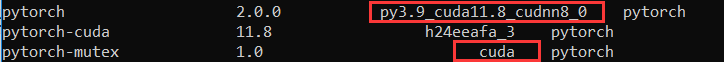 安装完毕之后,在命令行输入conda list查看安装情况,可以找到这几个,就说明安装成功,注意红色框指:pytorch类型版本为cuda版。