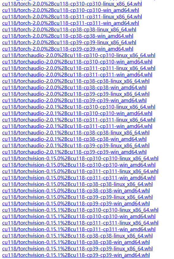 根据如此规律,我们找到conda install pytorch torchvision torchaudio pytorch-cuda=11.8 -c pytorch -c nvidia CUDA11.8版本对应的各类软件包。如下图: