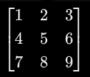 ,如果用数组可以表示为**array[[1,2,3],[4,5,6],[7,8,9]],每个括号的元素组成矩阵的行 1 2 3/4 5 6/7 8 9,每一行的相同索引位置组成矩阵的列1 4 7/2 5 8/3 6 9**,