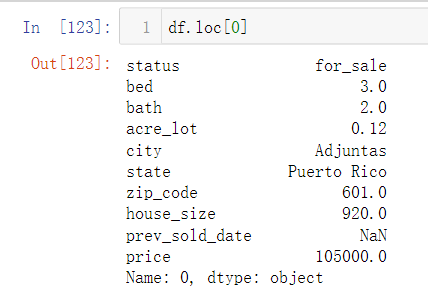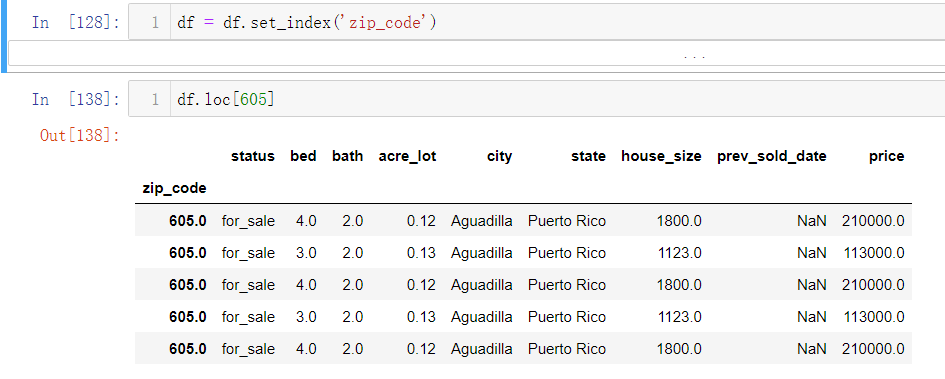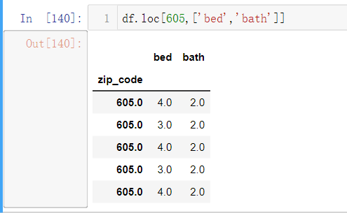 - df[605,[‘bed’,’bath]]表示查找605邮编,标签为bed、bath的数据(和上述df.loc[0:5,[‘bed’,’bath’]]类似,只不过行索引换成了邮编号)