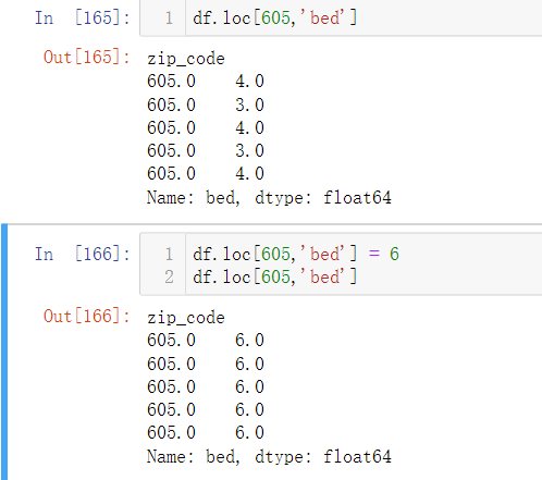 - df.loc[605,’bed’]=6表示找到该行列的数据,然后对它赋值
