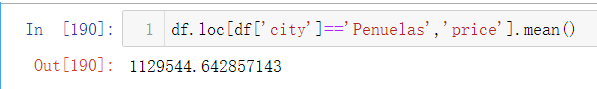 df.loc[df[‘city’] == ‘Penuelas’,’price’].mean():计算位于Penuelas城市的房价平均值