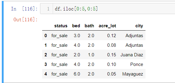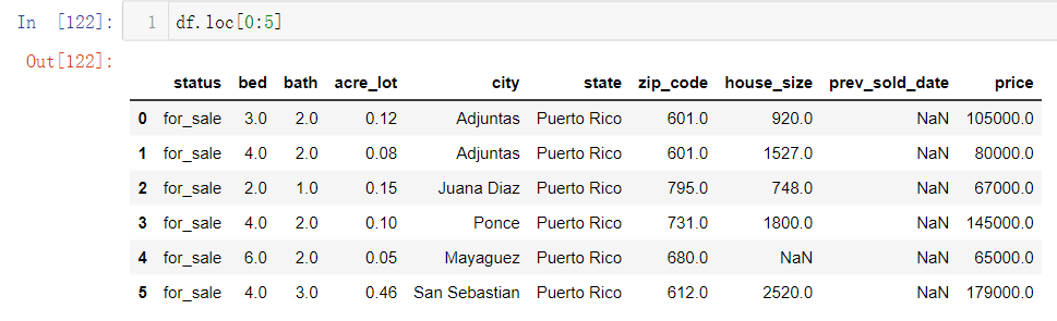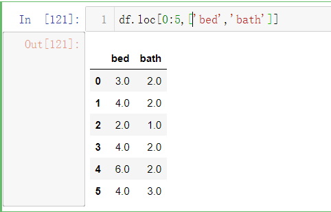 - df.loc[0:5,[‘bed’,’bath’]]表示前五行标签为bed与bath的数据