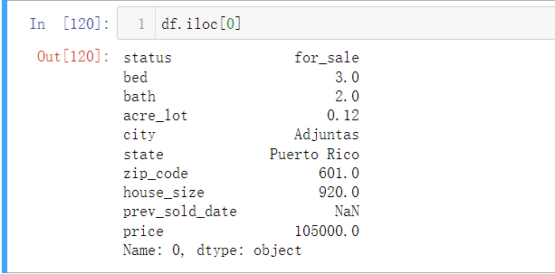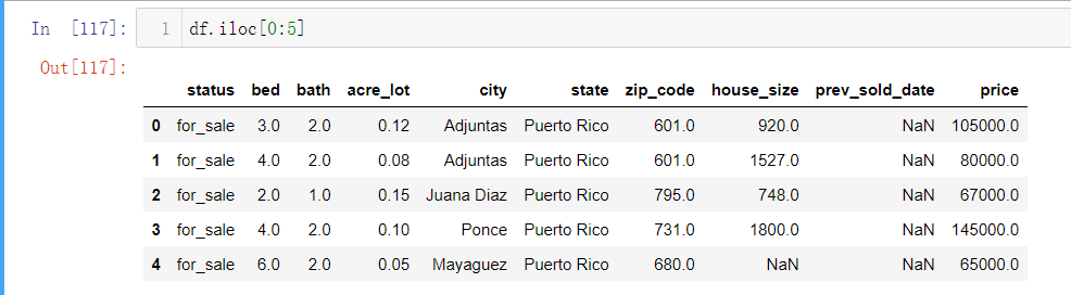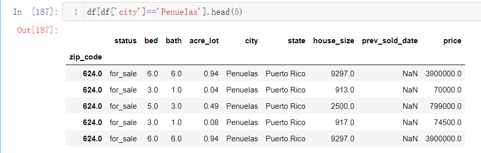df[df[‘city’]==’penuelas’].head(5):展示前五条位于penuelas城市的房屋数据。