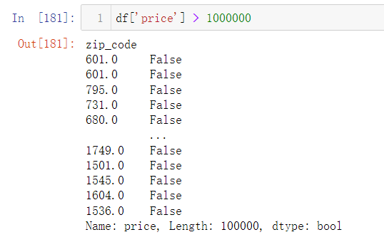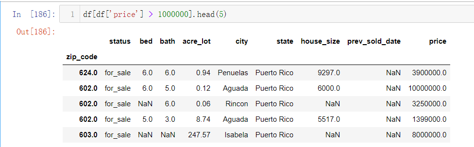 df[‘price’]>1000000 : 筛选房价大于1000000美金的房屋邮编