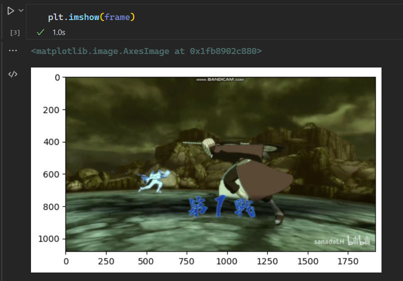 plt.imshow(frame)显示读取到帧图片,注意这样显示的图片与原视频颜色不一致,是因为输出颜色为BGR格式