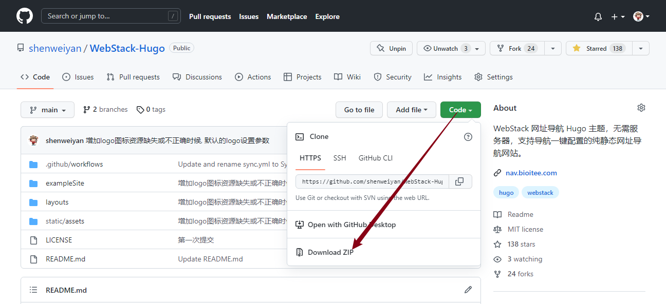 浏览器打开 https://github.com/shenweiyan/WebStack-Hugo ,点击 Code 下的Download ZIP,把 WebStack-hugo-main.zip 下载到刚才 hugo 解压缩的目录(F:\WebStack)。